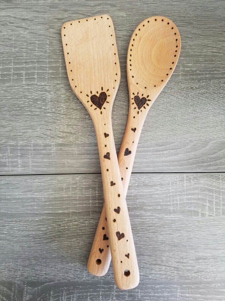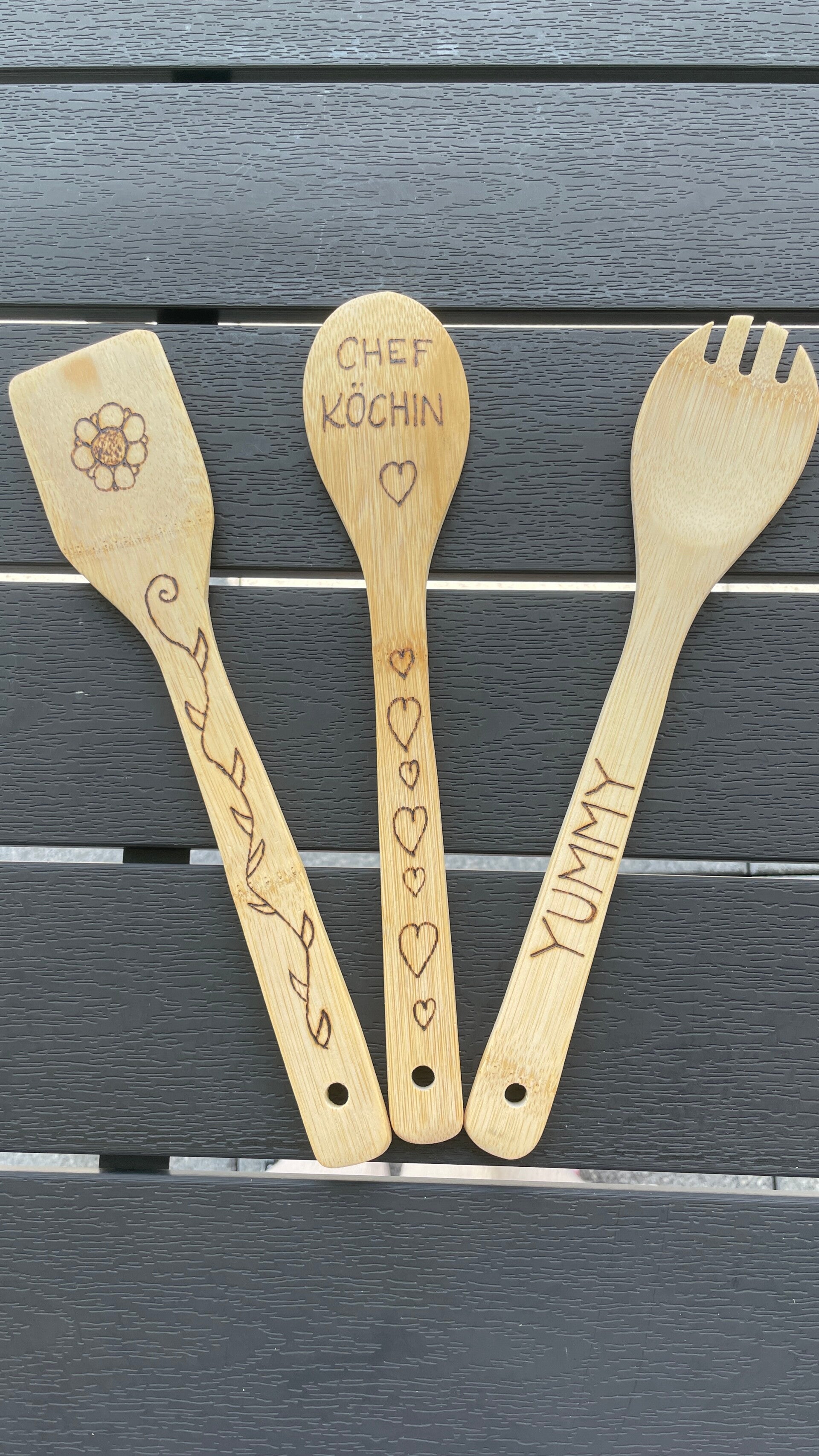 Individuell gebrannte Holz-Kochlöffel und Topfumtersetzer aus Kork mit Name, Spruch oder Motiv.